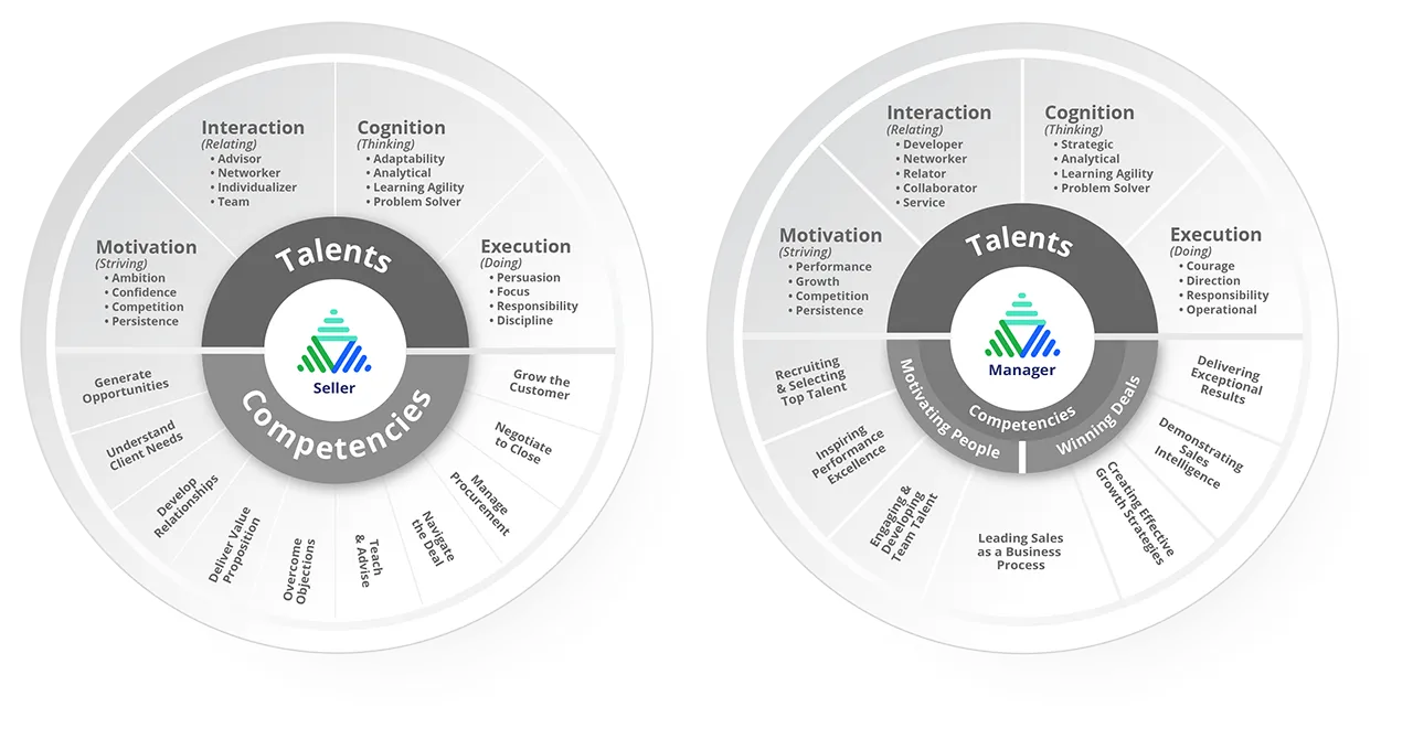 The TalentIQ sales assessment is built specifically for sales. It breaks apart and measures the innate talents and the competencies, or learned skills, that are most critical to sales performance. This data is used to develop individualized playbooks for both your sellers and your sales managers outlining four key elements for each individual: